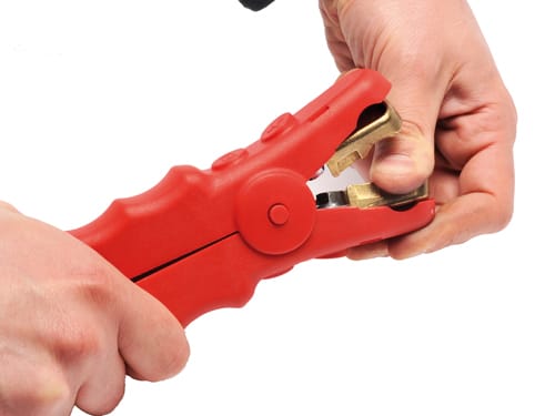 El engaste del terminal tubular es uno de los puntos más delicados del montaje de pinzas de batería. Si no se realiza correctamente, el contacto puede ser deficiente o aflojarse con el uso, por lo que es importante utilizar una herramienta adecuada y comprobar que el terminal queda bien sujeto al cable.